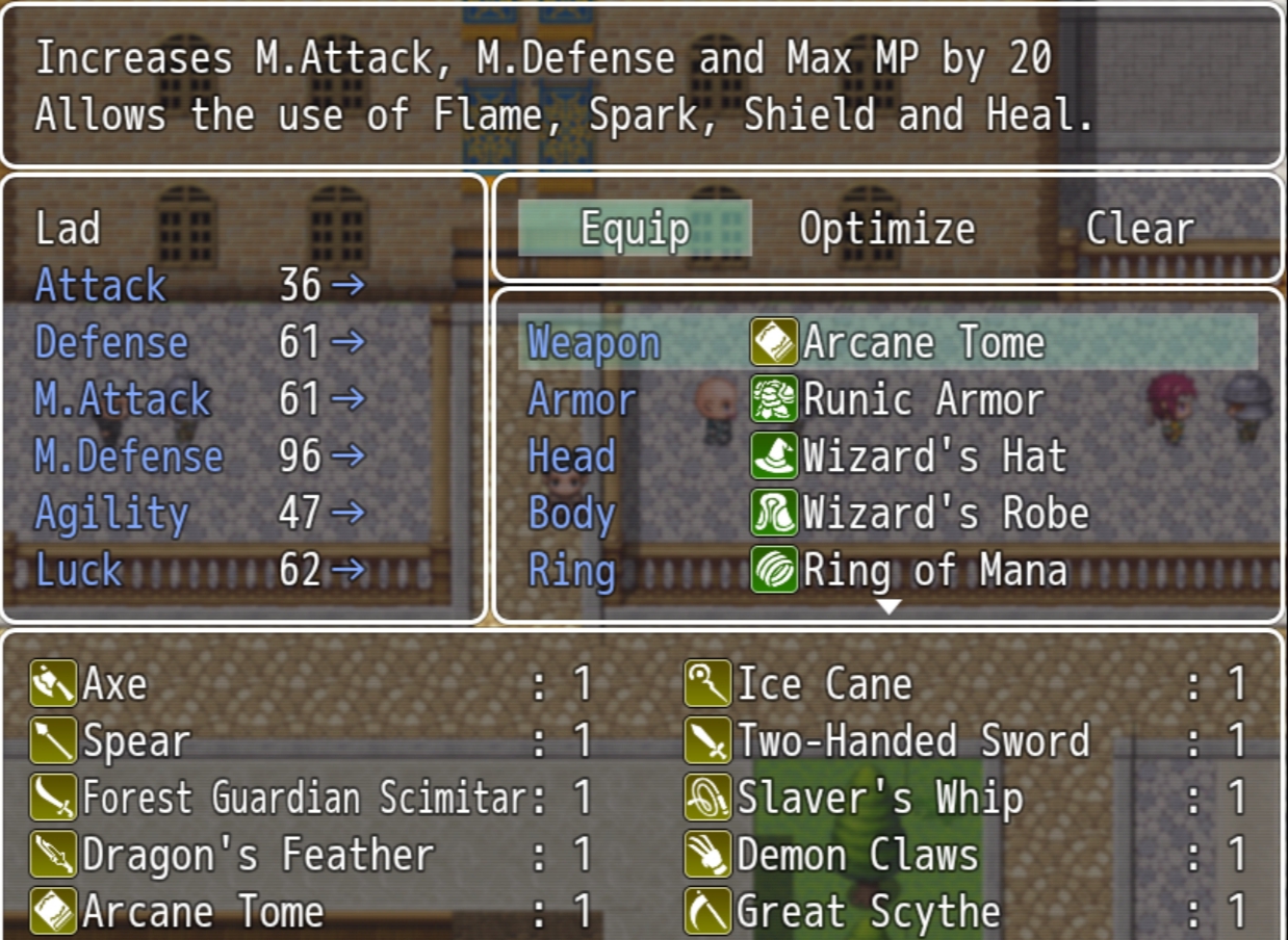 For a mage I would equip Cloak of Speed, Adamantite Helmet, Warlock's Ring and Amulet of Mana. You can also trade 10 max HP for 20 max MP indefinitely at the Academy of Magic, so between HP and MP, HP it's always better. At the statue in the beginning you can gain 50 max HP (equals 100 max MP later), after finishing the quest at the cemetery you can also choose between a potion that expands you MP by 50 or your HP by 100 (this can become 200 max MP at the academy). With 750 max MP and Amulet of Mana, you regen 75 MP every turn, making the battles a lot more manageable.